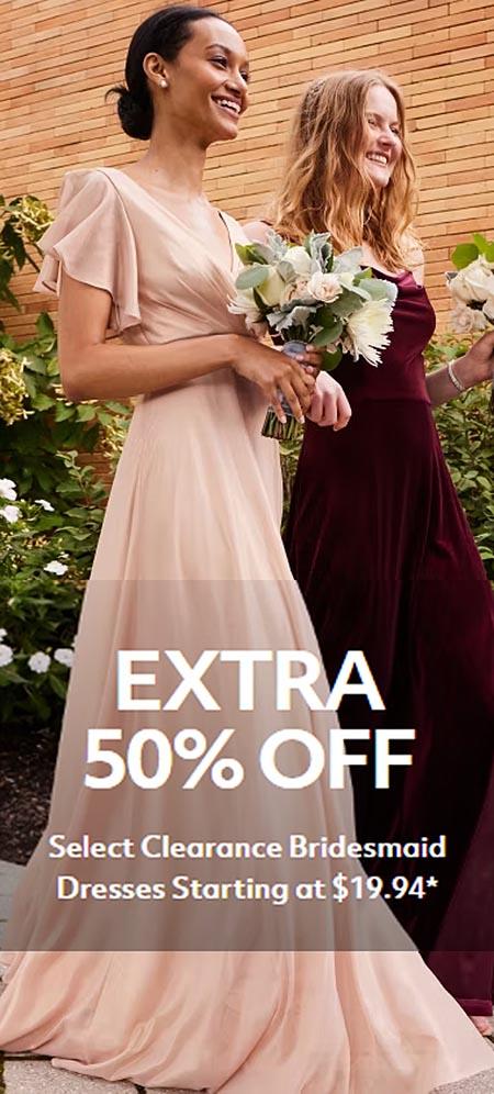Hurry in and get an extra 50% off on select clearance bridesmaid dresses starting at $19.94 in store for a limited time.