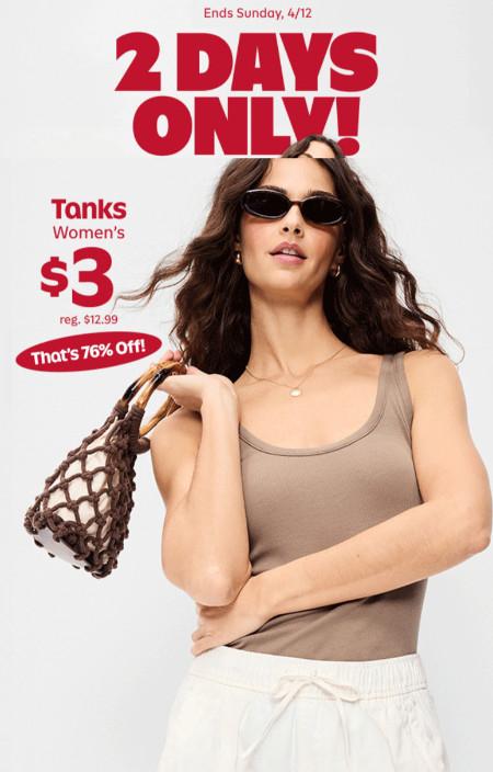 Offer valid on select Tanks merchandise only from 4/11/26 through 4/12/26 in the Us (including Puerto Rico) at Old Navy stores. While supplies last. Excludes Clearance & Maternity. Limit 5 per transaction. Select styles only. Not valid on international purchases. Discount applies to merchandise only, not value of gift cards purchased, packaging, applicable taxes or shipping & handling charges. Not valid for cash or cash equipment. Cannot be combined with other offers or discounts, including Gap Inc. employee discount. Gap Inc. is not responsible for lost or stolen coupons. Discount applies at checkout.